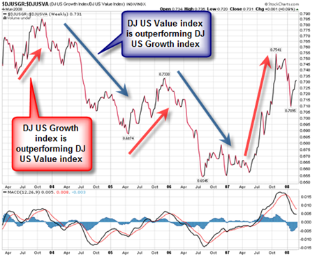 Investors favours sometimes value stocks sometimes growth stocks. As it can be seen from the image below, a trader might think of trading value or growth stocks depending on their trend.